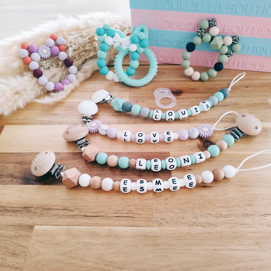 Nous vous proposons une sélection d’attaches sucettes personnalisées avec le prénom entièrement faites main.
