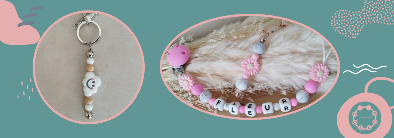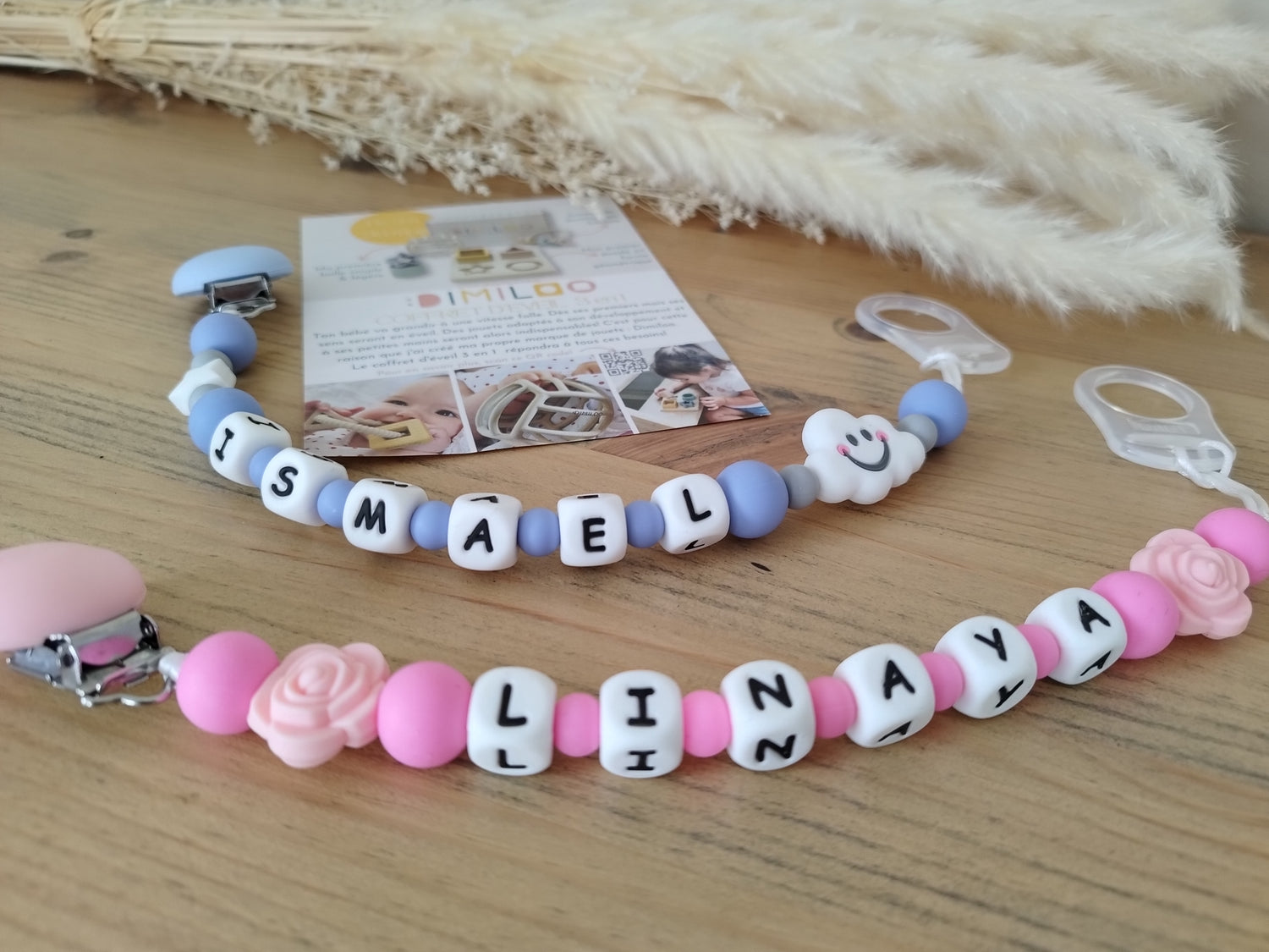 Vous avez la possibilité de choisir toutes les perles et couleurs de l'attache sucette personnalisée de votre bébé grâce à l'attache tétine sur mesure.